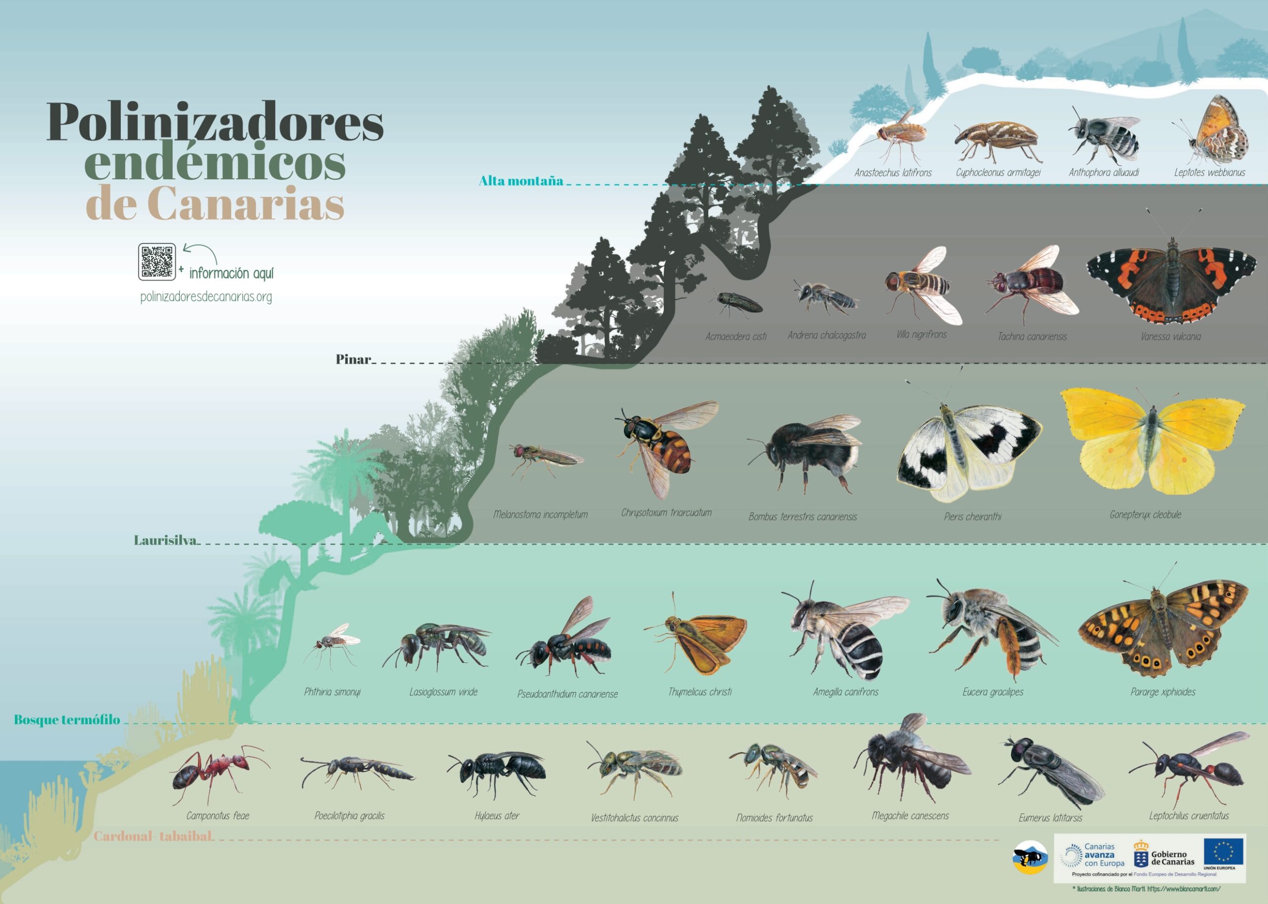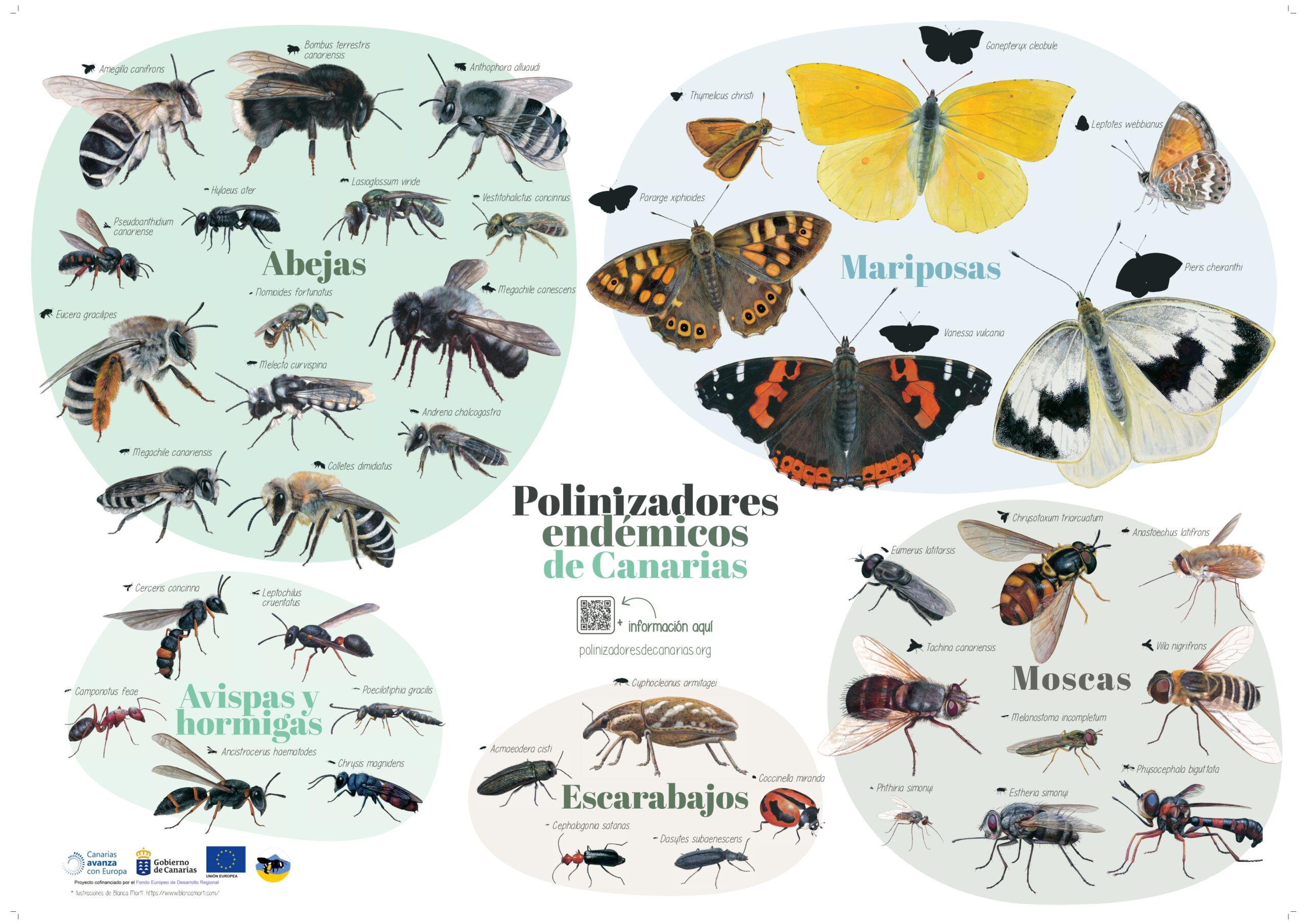 Para empezar, enmarcado en el proyecto financiado por la Estrategia de Especialización Inteligente de Canarias RIS-3 y gracias al talento de Blanca Martí hemos generado una serie de ilustraciones de los polinizadores endémicos más representativos de nuestra fauna. Con el diseño de Teresa Velázquez, estas ilustraciones se han compilado en tres pósteres únicos sobre los polinizadores endémicos de Canarias, cada uno resaltando un aspecto importante de su ecología.