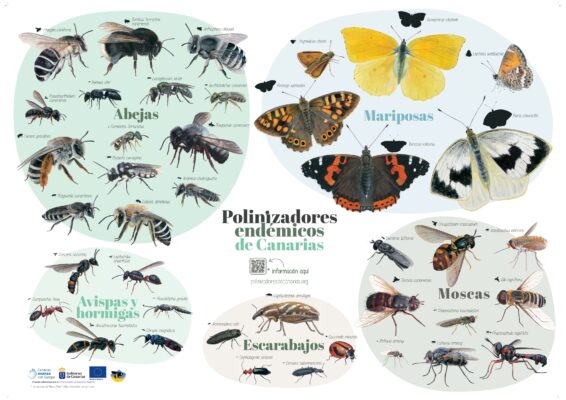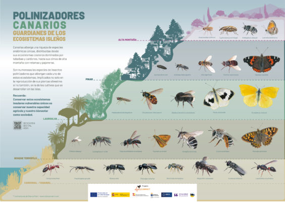 Representación de los diferentes pisos de vegetación de las islas, con algunas de las especies de polinizadores frecuentemente asociadas a cada uno de ellos